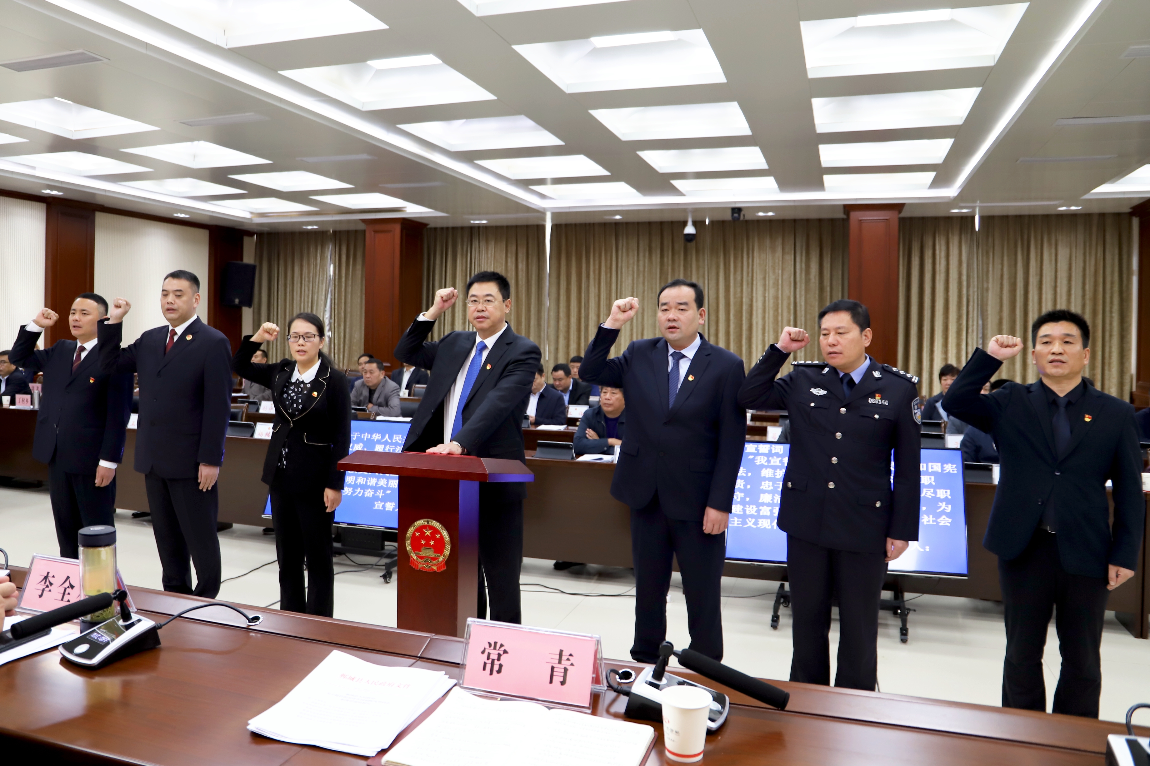 李建軍向新任命同志頒發(fā)任命書(shū);在縣人大常委會(huì)組成人員監(jiān)誓下,新任命的同志由常青領(lǐng)誓向憲法進(jìn)行了宣誓。