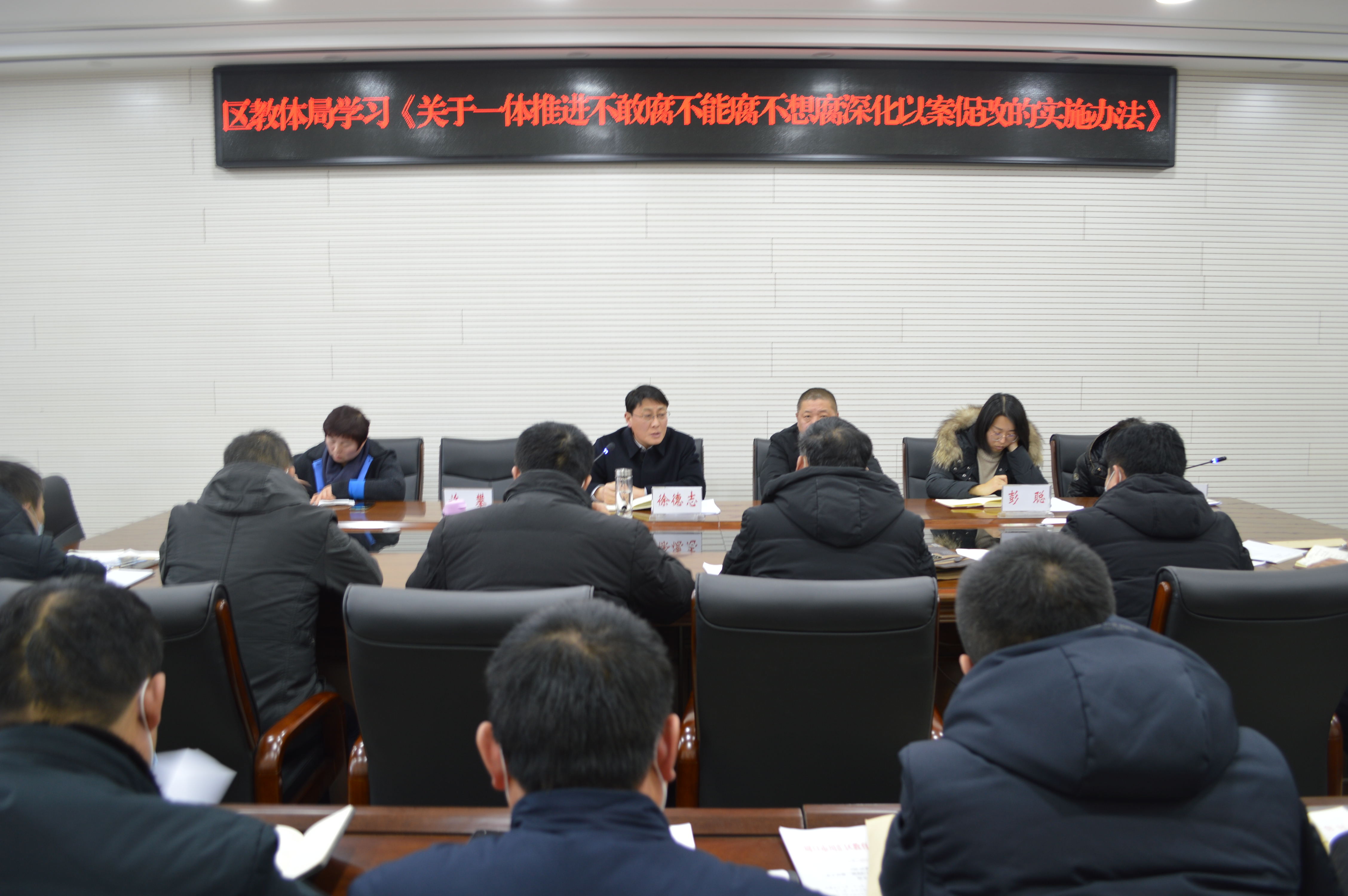 川匯區(qū)教體局黨組書記、局長徐德志強(qiáng)調(diào),要把思想和行動統(tǒng)一到一體推進(jìn)“三不”深化以案促改工作中,通過反思剖析教育體育系統(tǒng)近年來發(fā)生的違紀(jì)違法案件,深入查找風(fēng)險漏洞,強(qiáng)化警示教育,整改突出問題,健全完善制度,促進(jìn)權(quán)力結(jié)構(gòu)配置更加科學(xué)、權(quán)力運行更加規(guī)范透明,教育引導(dǎo)黨員干部堅定理想信念、增強(qiáng)黨性觀念、提高道德修養(yǎng)、強(qiáng)化紀(jì)律意識,一體推進(jìn)不敢腐不能腐不想腐機(jī)制建設(shè),持續(xù)營造學(xué)的氛圍、嚴(yán)的氛圍、干的氛圍,為推動全區(qū)教育體育事業(yè)高質(zhì)量發(fā)展提供堅強(qiáng)的政治保證。