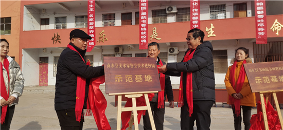 與會領(lǐng)導分別為“川匯區(qū)書畫院書法進校園示范基地”“商水縣書法家協(xié)會書法進校園示范基地”“商水縣美術(shù)家協(xié)會美術(shù)進校園示范基地”揭牌。中國書法家協(xié)會會員、中國作家協(xié)會會員、周口師范學院特聘教授張華中,周口市書法家協(xié)會副秘書長、川匯區(qū)文聯(lián)副主席游富華,以及我縣原政協(xié)副主席、商水縣美術(shù)家協(xié)會主席司新國,河南省書法家協(xié)會會員、文聯(lián)主席劉秋玲,中國書法家協(xié)會會員、商水縣書協(xié)主席趙世貴 ,中國美術(shù)家協(xié)會會員郭保同,河南省書法家協(xié)會會員關(guān)保證、王艷飛、沈曉虹,河南省美術(shù)家協(xié)會會員李飛等市縣知名書畫家向?qū)W校捐贈了墨寶。