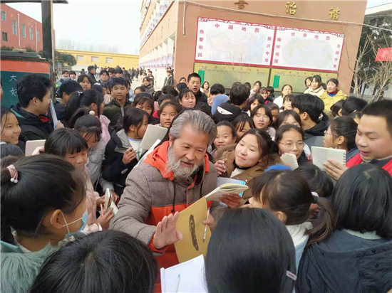 書畫家們的到來,受到學子們的歡迎,千名學生將書畫家們團團圍住,像追星一樣,討教書法藝術(shù)。書畫家門興致盎然,揮毫潑墨,留下 “上善若水”“業(yè)精于勤”、及花鳥圖、山水畫等作品100余幅,并與師生現(xiàn)場互動、傳經(jīng)送道、指點學生書法作品的得失。