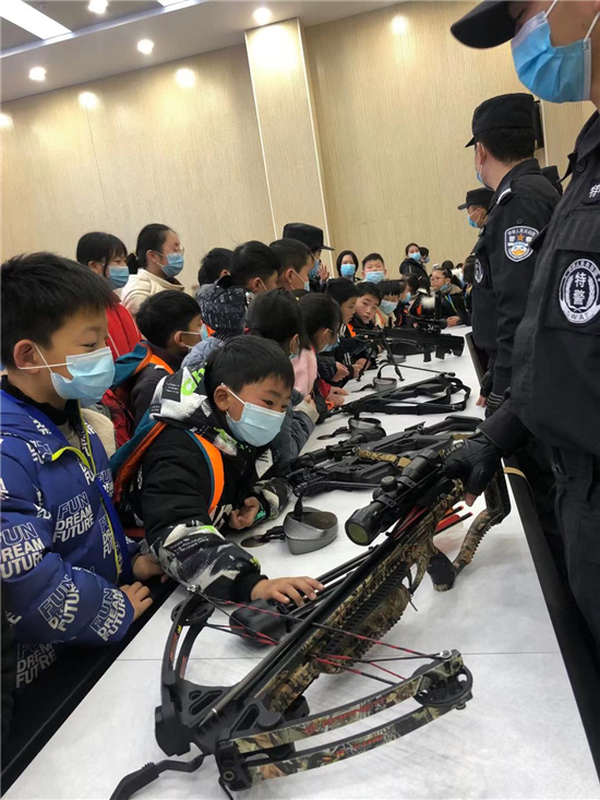 在指揮中心大廳,小記者們還有序參觀了現(xiàn)場展示的特殊警用裝備。除了手槍外,還有沖鋒槍、狙擊步槍、激光炫目槍和強(qiáng)力弓弩等。市公安局特警支隊民警向小記者們介紹了各種槍支及裝備的性能和使用方式,并邀請小記者觸摸一把警用槍械。