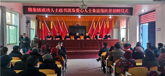 1月29日,天氣乍暖還寒,魏集鎮(zhèn)政府人頭攢動(dòng),喜氣洋洋,一片熱鬧的景象。內(nèi)蒙古希拉穆仁旅游置業(yè)開發(fā)有限公司董事長(zhǎng)、內(nèi)蒙古楊子照明鋼桿制造有限責(zé)任公司董事長(zhǎng)、內(nèi)蒙古周口商會(huì)會(huì)長(zhǎng)趙書清和愛心人士朱富偉一行,帶著整整兩卡車米、面、油共計(jì)八萬元生活物資,回到家鄉(xiāng)魏集鎮(zhèn)開展扶貧濟(jì)困活動(dòng),在嚴(yán)寒的冬日給魏集鎮(zhèn)困難群眾帶來了溫暖和祝福??h政協(xié)主席孫培忠,縣委常委、宣傳部長(zhǎng)李本磊出席活動(dòng)。魏集鎮(zhèn)黨委書記衛(wèi)春忙,鎮(zhèn)長(zhǎng)劉艷光參加活動(dòng)。