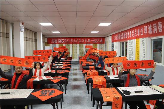 春節(jié)前夕,鄲城縣的書法家和書法愛好者們便更顯活躍,他們進機關(guān)、進企業(yè)、進社區(qū)、進學(xué)校、進農(nóng)村,把富有中國特色的新春祝福,富含中國傳統(tǒng)文化的春聯(lián),送到千家萬戶。