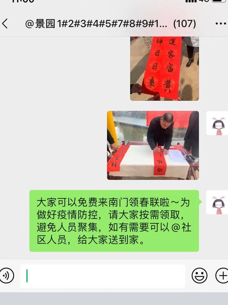 2月3日,為做好社區(qū)防疫工作,周口市城鄉(xiāng)一體化示范區(qū)景園社區(qū)一改往年現(xiàn)場寫、集中送的免費(fèi)送春聯(lián)活動形式,把“寫春聯(lián)”與“送春聯(lián)”分開,通過微信群向社區(qū)居民展示書法愛好者的春聯(lián)作品,讓居民在線挑選,按需有序領(lǐng)取,避免人群聚集。同時(shí),針對社區(qū)老年人等行動不便群體,主動送春聯(lián)上門,確保送“?!迸c防疫兩不誤。