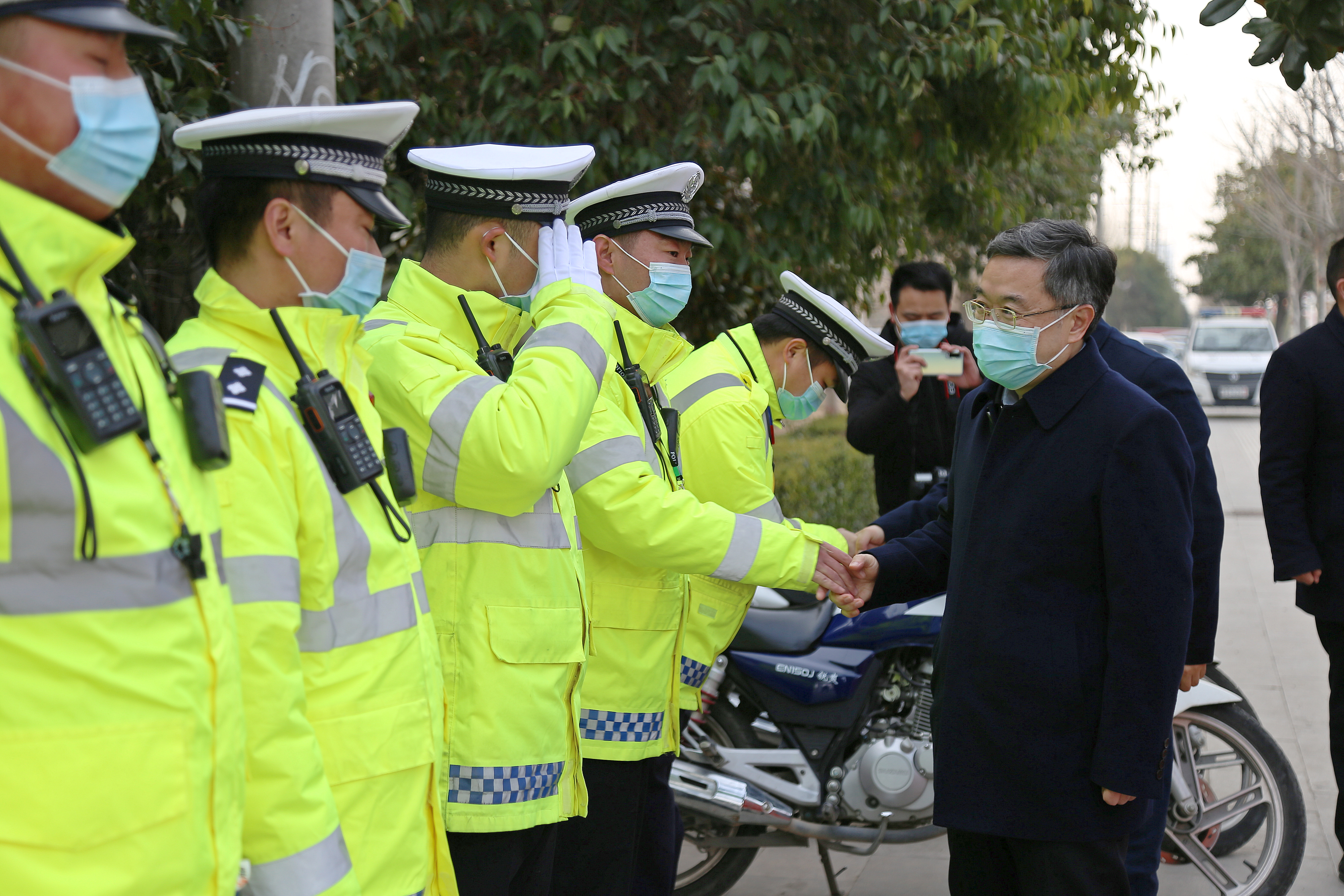 在縣交警大隊城區(qū)新區(qū)中隊五岔路口執(zhí)勤點,皇甫立新、劉國慶同正在執(zhí)勤的交通民警一一握手,并代表縣四個班子向交警大隊全體民警、協(xié)警一年來付出的努力和辛苦表示感謝和問候,囑咐他們要注意安全,保重身體。在詳細聽取春節(jié)期間治堵保暢工作情況匯報后,皇甫立新對交警大隊全體民警和輔警在春節(jié)期間舍小家為大家,始終堅守崗位保暢通的工作態(tài)度,以及無私奉獻、任勞任怨的工作作風(fēng)給予高度評價。并希望大家在春節(jié)期間,繼續(xù)發(fā)揚吃苦耐勞的精神,科學(xué)做好道路安全保障工作,克服車多人多等困難,確保春節(jié)期間全縣道路交通安全暢通,讓全縣人民愉快度過一個平安、祥和的春節(jié)。同時要求縣交警大隊要進一步做好執(zhí)勤民警后勤保障及防寒保暖工作,加強人員輪換上崗,切實保障公安交警切身利益,解決他們的后顧之憂。