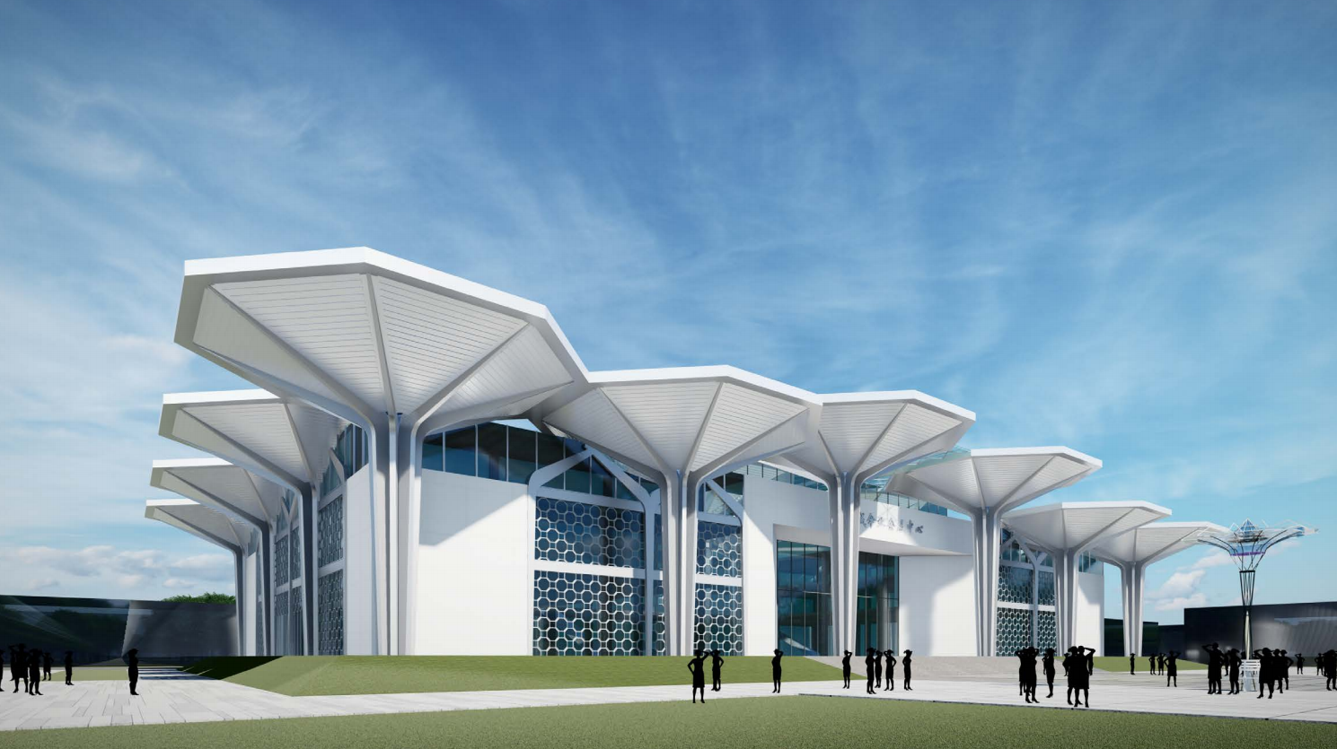 鄲城縣傘業(yè)產(chǎn)業(yè)園電子商務(wù)服務(wù)中心項(xiàng)目是鄲城縣傘業(yè)全產(chǎn)業(yè)鏈展銷(xiāo)的窗口項(xiàng)目、展示項(xiàng)目。會(huì)展中心的設(shè)計(jì)概念以“傘啟鄲興”為主題,基于對(duì)本土特色文化的深入解讀、同時(shí)結(jié)合“傘”的具體特征,提煉傘蓋、傘骨、傘柄的特殊形象為基本元素。建筑主立面以八個(gè)巨大傘形構(gòu)架依次展開(kāi),巨型的尺度、新穎的造型有極強(qiáng)的昭示性,裝飾幕墻八邊形的單元分割也隱喻了傘蓋的造型,創(chuàng)新的視覺(jué)形象為傘業(yè)產(chǎn)業(yè)園增加了新的注解。會(huì)展中心整體的建筑風(fēng)格充分展示了鄲城傘業(yè)產(chǎn)業(yè)園的核心價(jià)值,形成獨(dú)具特色的地標(biāo)形象。