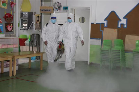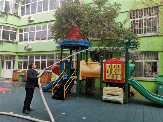 2月27日下午, 周口市市直幼兒園聯(lián)系周口市藍(lán)天救援隊(duì)專業(yè)消殺人員,對幼兒園的公共區(qū)域環(huán)境、大型玩具、走廊、活動室等場所逐步實(shí)施消殺,重點(diǎn)對樓道、樓梯扶手、衛(wèi)生間等關(guān)鍵區(qū)域?qū)嵤┟芗荆龅饺妗氐?、不留死角?/p>