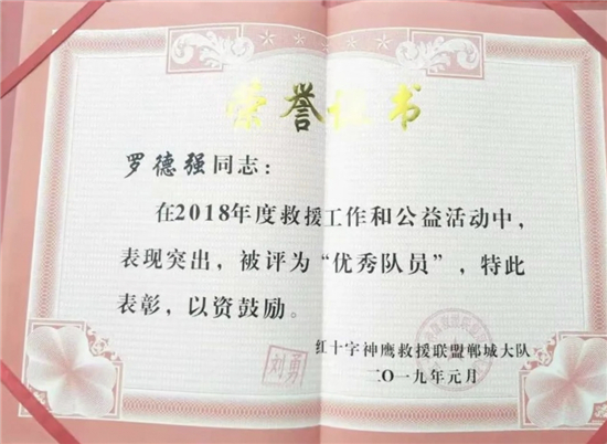 鄲城縣神鷹救援隊(duì)隊(duì)長劉勇說,正是看到了羅德強(qiáng)的優(yōu)秀品質(zhì),2018年將羅德強(qiáng)吸納為神鷹救援隊(duì)員。“神鷹救援聯(lián)盟鄲城大隊(duì)隸屬于中國神鷹救援隊(duì),由各個(gè)行業(yè)的志愿者組成,也是河南省成立最早的一支民間救援隊(duì),除參加全國各地災(zāi)后救援活動(dòng)外,日常積極參加社會(huì)志愿者活動(dòng)?!薄拔乙粋€(gè)人的力量很有限,加入這個(gè)優(yōu)秀集體,能夠?qū)W到更多專業(yè)救援知識(shí),從而幫助更多的人,我感到非常驕傲和自豪?!绷_德強(qiáng)說。2019年8月10日,受第九號(hào)臺(tái)風(fēng)“利奇馬”影響,山東省壽光市、東營市等部分地區(qū)遭受洪災(zāi)。8月11日晚上,紅十字神鷹救援聯(lián)盟鄲城大隊(duì)趕赴山東壽光救災(zāi)。面對(duì)洪災(zāi),羅德強(qiáng)和其他救援隊(duì)員不畏辛苦,劃船深入各個(gè)受災(zāi)鄉(xiāng)村救助被困群眾。壽光市一鄉(xiāng)鎮(zhèn)3處大閘因斷電出現(xiàn)險(xiǎn)情,需要人力進(jìn)行開閘泄洪。羅德強(qiáng)和隊(duì)員冒險(xiǎn)攀爬到大閘上進(jìn)行人工作業(yè),經(jīng)過3個(gè)多小時(shí)的奮戰(zhàn),3處大閘全部打開,安全泄洪。2019年9月1日,參加泳渡日月潭返程途中,羅德強(qiáng)在福建高速公路上,發(fā)現(xiàn)前方車輛發(fā)生車禍,一名司機(jī)腿部骨折、血流不止。他立即下車和司機(jī)溝通,一邊報(bào)警,一邊利用專業(yè)救援知識(shí)打開變形的車門,順利將司機(jī)救出。“由于過度驚嚇,司機(jī)以骨折為由拒絕下車。當(dāng)我告訴司機(jī)自己是神鷹救援隊(duì)員、救援技術(shù)過硬后,才同意我們施救?!碑?dāng)時(shí)高速上車流密集,情況十分危險(xiǎn),如果司機(jī)不能及時(shí)救出,后果不堪設(shè)想?!拔覀冘囕v加油、住宿、吃飯等救援費(fèi)用都是隊(duì)員AA制負(fù)擔(dān),從來不給當(dāng)?shù)卣蚓戎颂砣魏温闊??!?/p>