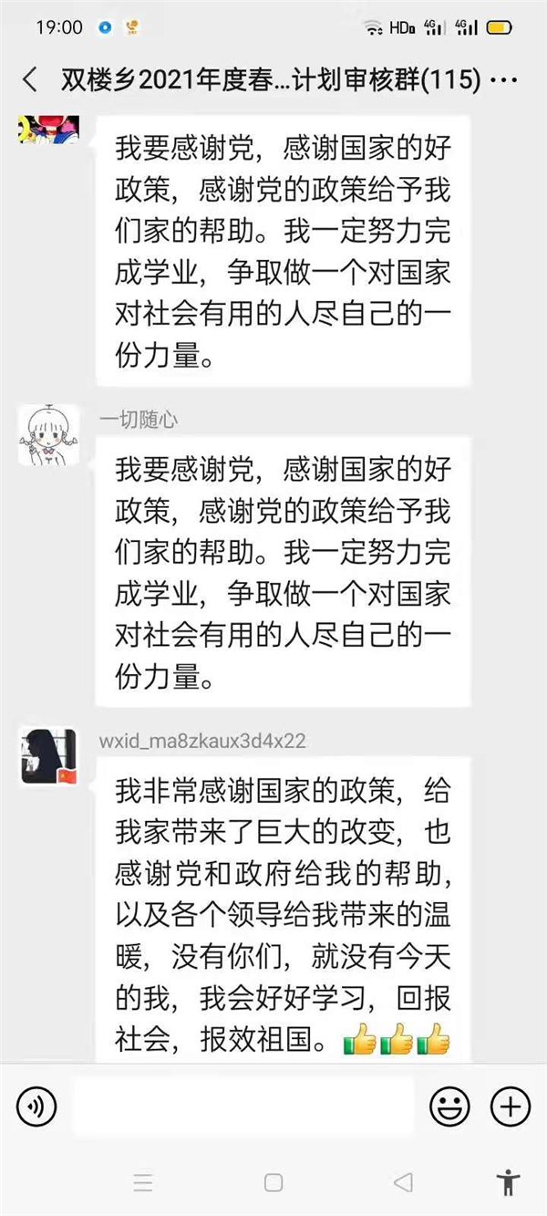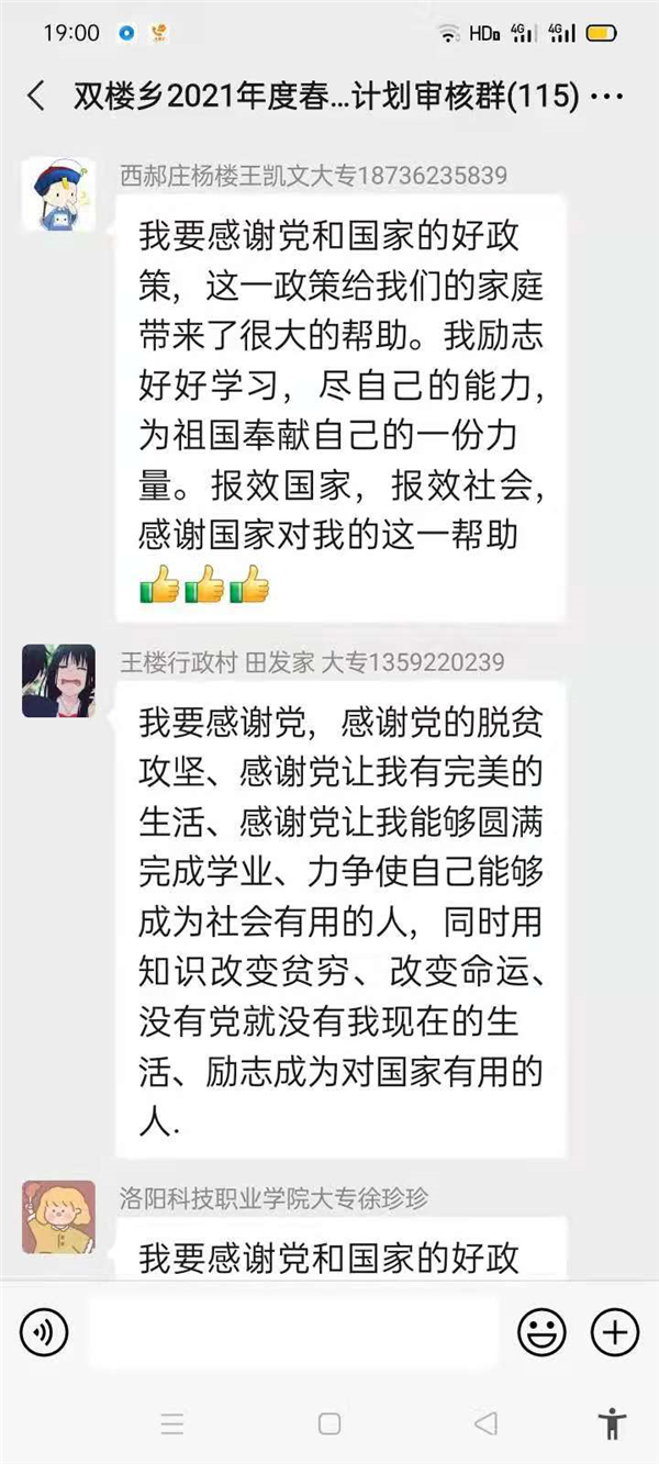 “感謝幫助過我家的所有幫扶人,沒有你們,就沒有我家今天的幸福生活,我們光榮脫貧了,作為貧困家庭中新成長勞動(dòng)力,我一定珍惜這次來之不易的學(xué)習(xí)機(jī)會(huì),好好學(xué)習(xí)技術(shù),畢業(yè)后回村成為一名技術(shù)帶頭人,來促進(jìn)家鄉(xiāng)產(chǎn)業(yè)的發(fā)展?!编惓强h雙樓鄉(xiāng)孫莊村脫貧學(xué)生張素華在微信群里說。近幾天,鄲城縣雙樓鄉(xiāng)114人的大學(xué)生微信群里可熱鬧了,在鄉(xiāng)黨委政府的引導(dǎo)下,該鄉(xiāng)眾多脫貧后的大學(xué)生通過鄉(xiāng)里建起的微信群,紛紛圍繞“話脫貧、感黨恩、奮進(jìn)新時(shí)代”這一主題交流思想,提振斗志。