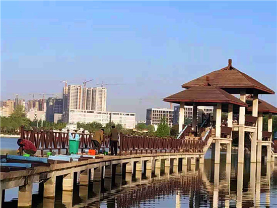 近日,位于文昌大道的周口公園啟動了對水上棧道的維修。周口公園的水上棧道和亭榭是一道美麗的風(fēng)景,成為人們游園打卡之地,然而因建造時用的是木材,歷經(jīng)風(fēng)雨,朽壞嚴重,存在安全隱患,周口公園方面于去年將之封閉。記者在現(xiàn)場看到,工人已經(jīng)將木質(zhì)扶欄、道上木板拆除,正在安裝鐵護欄。鐵護欄油漆成棕褐色,依然保持原棧道的風(fēng)格和色調(diào)。②7