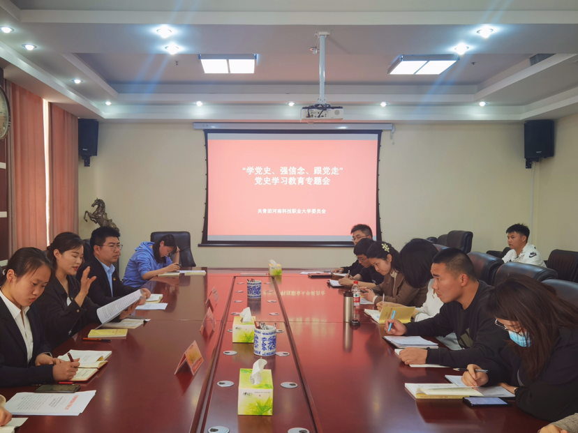 為認真貫徹習近平總書記在黨史學習教育動員大會上的重要講話精神,引領廣大黨員深入學習黨的歷史,深化青年厚植愛黨、愛國、愛社會主義的情感,4月29日,共青團河南科技職業(yè)大學委員會召開“學黨史、強信念、跟黨走"黨史學習教育專題會。