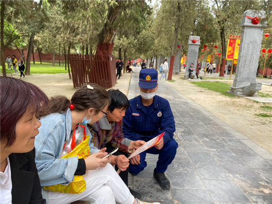 “旅游快樂每一天,消防安全得優(yōu)先;煙頭不能隨便丟,防火常識心中留。”5月1日,在太昊陵景區(qū),消防人員向游客發(fā)放防火宣傳單,得到了游客廣泛點贊。消防人員針對景區(qū)防火實際,向游客大力宣講各類消防安全知識,倡議游客主動上交打火機等各類火種,在景區(qū)內(nèi)各類防火宣傳提示也是隨處可見。②5