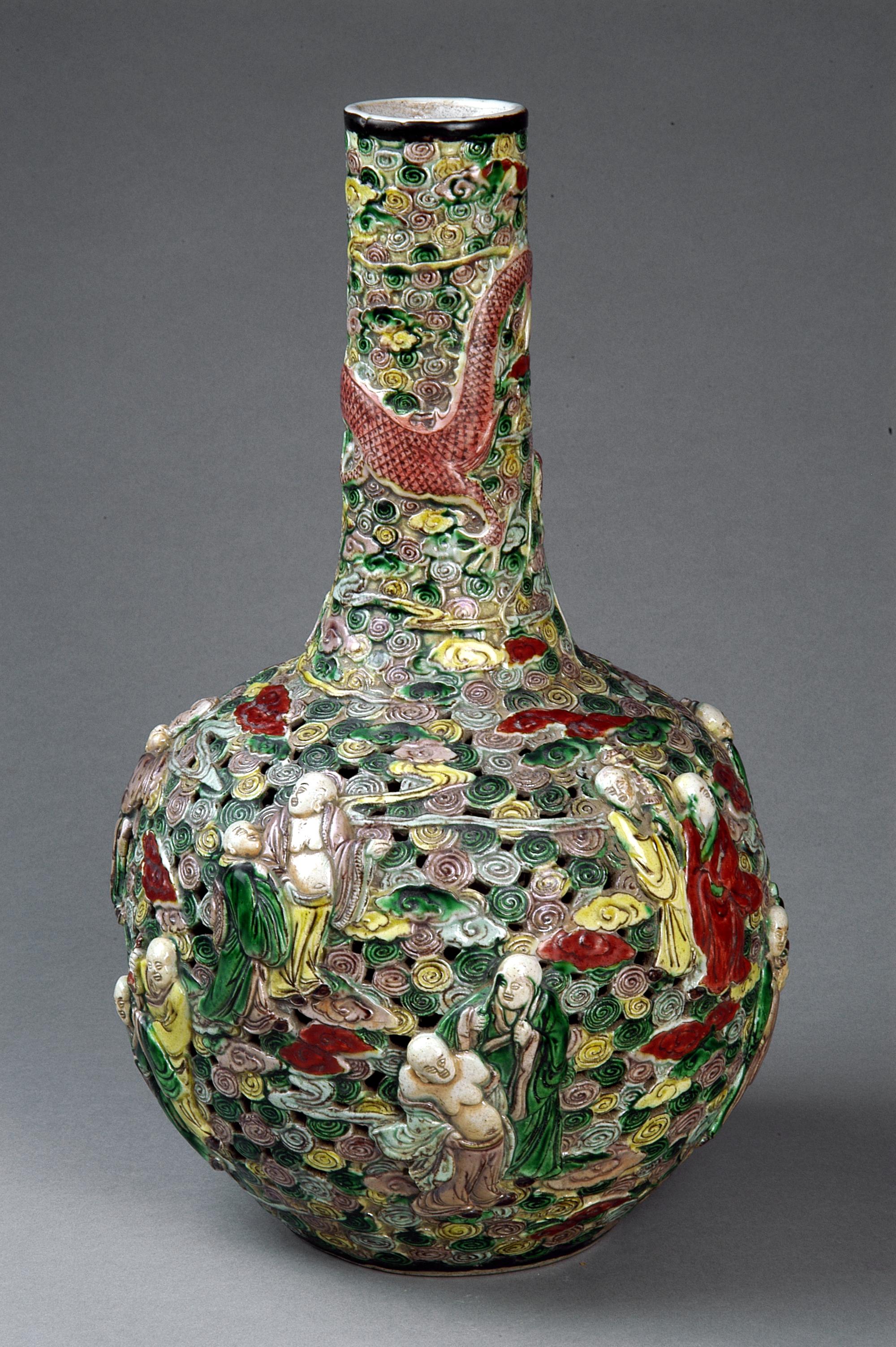 我是五彩透雕十八羅漢云龍瓶,又名古瓷流韻天球瓶。靜謐的空間里,我站在周口市博物館的玻璃展柜里,瞅瞅四周的兄弟姐妹,我偷偷笑了。雖沒有長睫毛和雙眼皮,但我可是個十足的“混血兒”。技藝精湛、圖案華貴、色彩艷麗,我的稀有性和珍貴性常常讓來訪者驚嘆不已。和青花瓷相比,我更加瑰麗多彩,人稱文物界的“米蘭·可兒”。