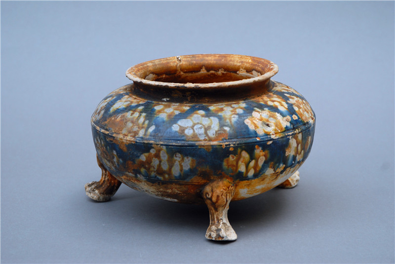 1998年10月,沉睡許久的唐藍(lán)釉三彩爐迎來(lái)了它的今世。周口市農(nóng)村信用社在建工地上,發(fā)現(xiàn)了一座唐代墓葬。在其中沉睡的唐藍(lán)釉三彩爐被吵醒,來(lái)到了它的新家——周口市博物館。它敞口,圓唇,短立徑,弧肩,鼓腹,下有三獸蹄足支撐它站立,樣貌圓潤(rùn)飽滿,與唐代藝術(shù)豐滿、健美、闊碩的特征是一致的。唐藍(lán)釉三彩爐不僅體現(xiàn)了唐代人的制陶工藝和智慧,更是絲綢之路與中西文化和物資交流融合的見(jiàn)證,渾身散發(fā)歷史與藝術(shù)的魅力。