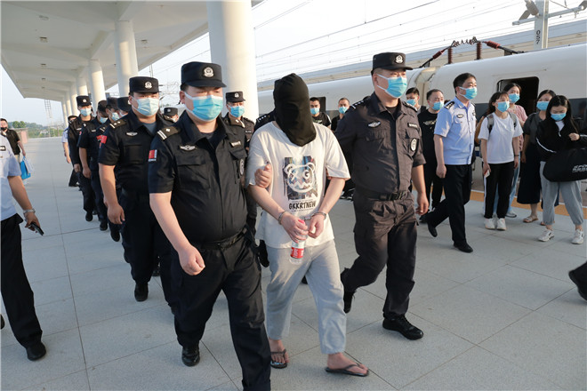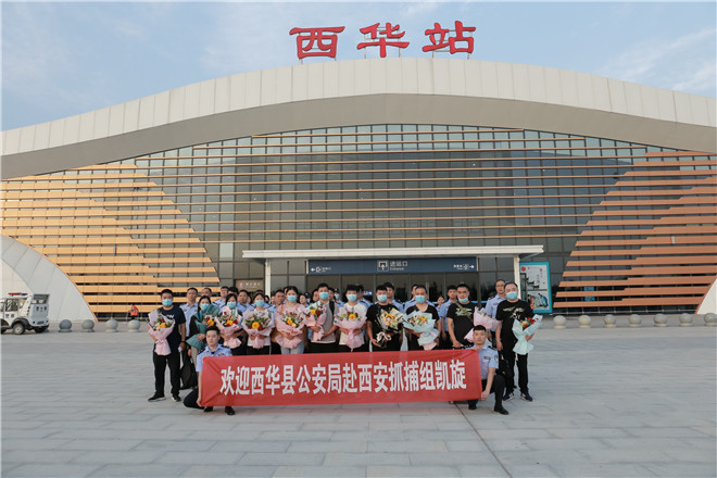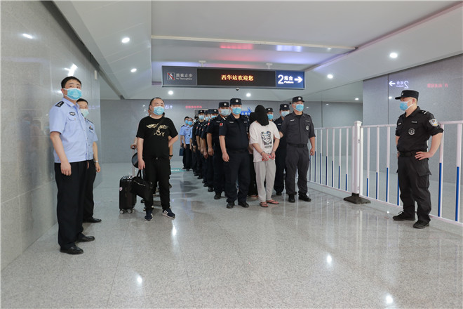 當天,西華縣公安局在鄭阜高鐵西華站舉行歡迎儀式,迎接赴西安抓捕組凱旋歸來。特警在站臺上排列整齊、嚴陣以待,列車準時??康秸荆?名犯罪嫌疑人隨即被押解下車,全副武裝的特警立即上前進行押解交接,押往在高鐵出站口等候的裝甲車上。至此,歷經三天三夜,一起電信網絡詐騙團伙案成功告破。