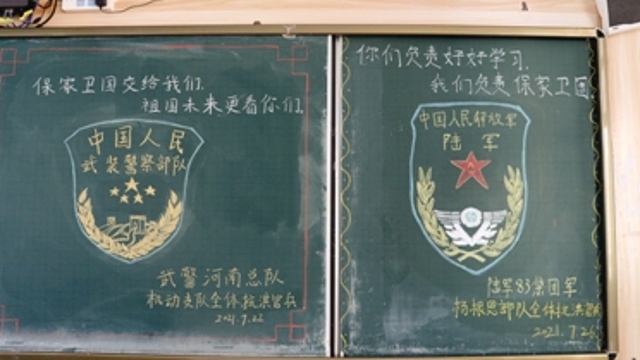 ??“保家衛(wèi)國交給我們,祖國未來更看你們!”“你們負(fù)責(zé)好好學(xué)習(xí),我們負(fù)責(zé)保家衛(wèi)國!”在鄭州市第七十三中學(xué)的一間教室里,參與救災(zāi)援助的抗洪官兵們給同學(xué)們留下了兩幅黑板報。在師生們眼里,這就是名副其實(shí)的“最美黑板報”。