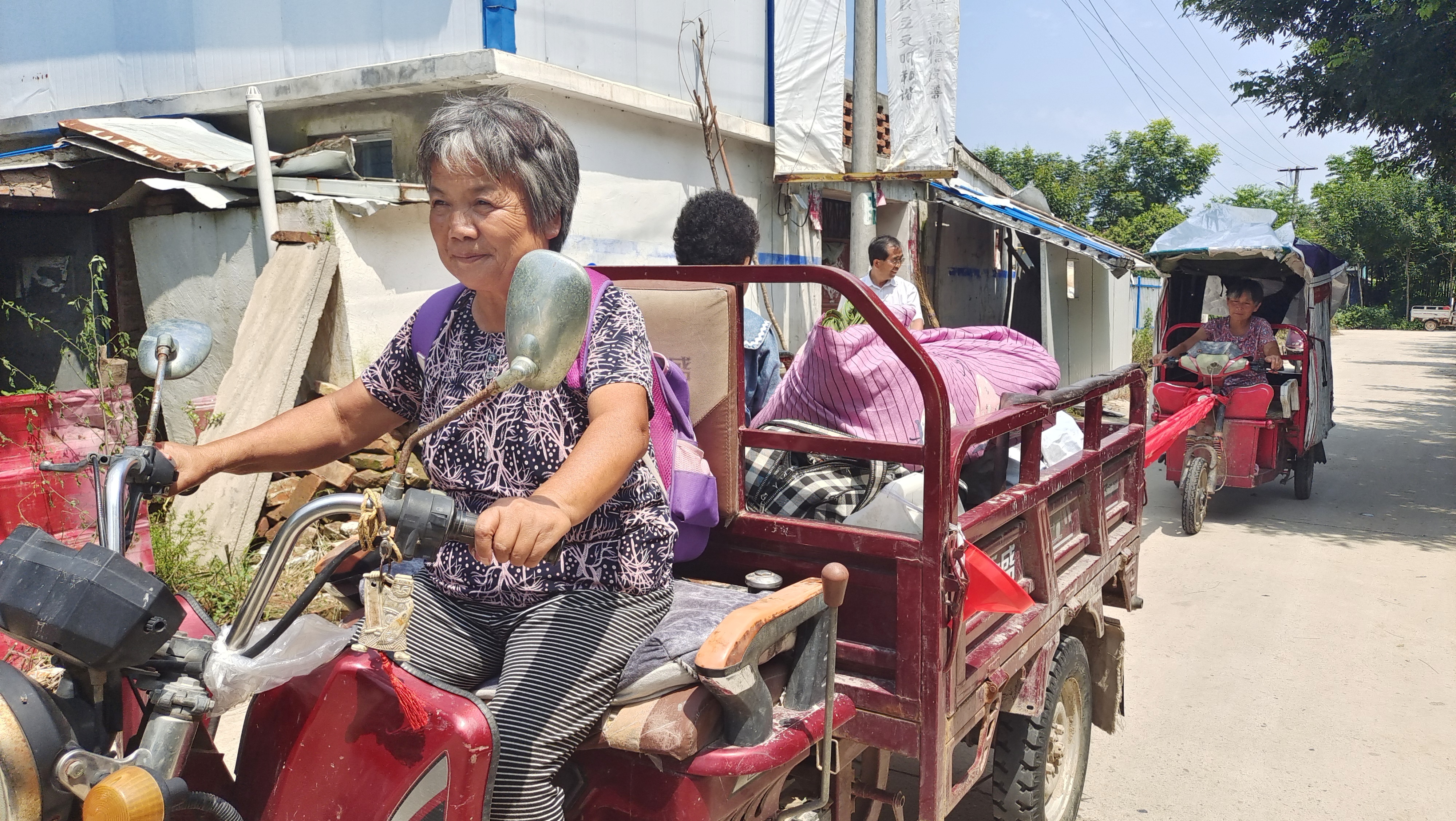 駛出不到幾百米,張梅碰到鄰居王妞的電動(dòng)三輪車沒電了,這可讓王妞急出一把汗。她們一商量,就在車上找了一段舊條幅,由張梅的機(jī)動(dòng)三輪車牽著王妞的電動(dòng)三輪車?yán)^續(xù)趕路。