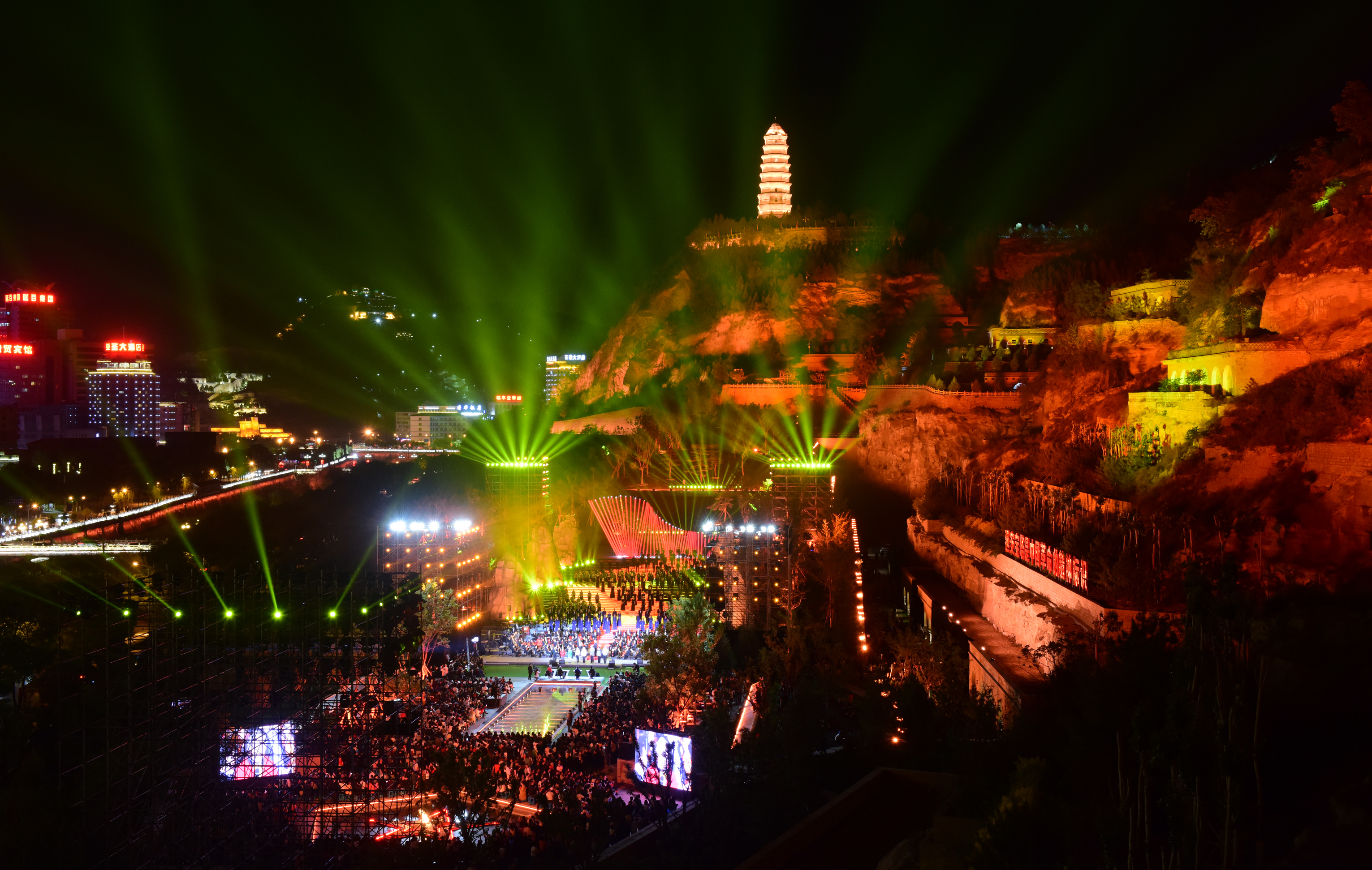 夜幕降臨,延安的寶塔山上,一場(chǎng)融實(shí)景、音樂和燈光為一體的燈光秀“講述”著延安的紅色歷史。延水河畔,一批批游客前來“打卡”。