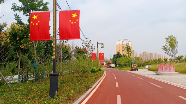 ?9月30日,市區(qū)臨街商鋪門前五星紅旗隨處可見,紅旗隨風(fēng)飄揚(yáng),將街道裝扮一新,喜迎國慶節(jié)的到來