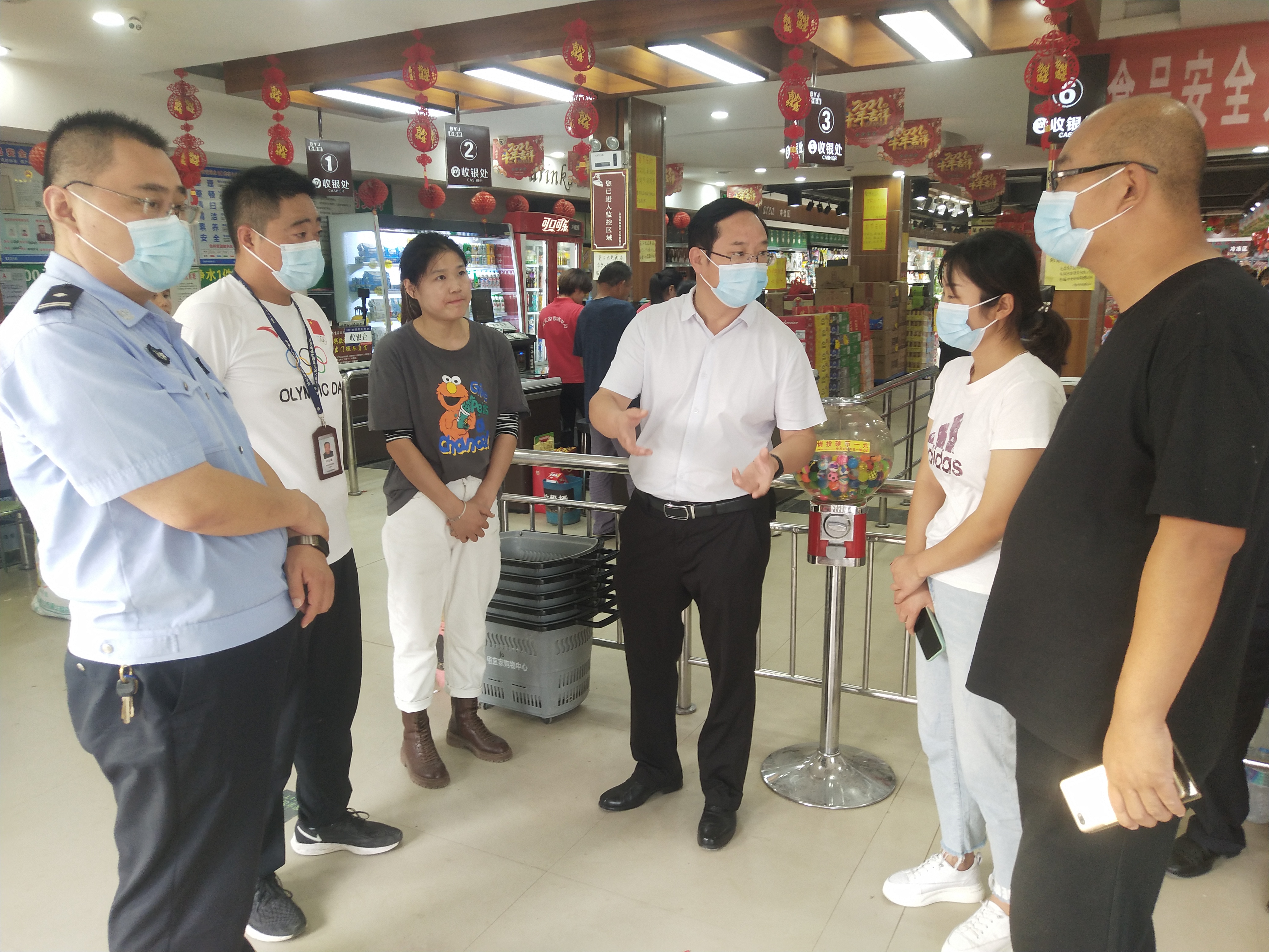 “通過(guò)突擊暗訪檢查發(fā)現(xiàn),你們能夠時(shí)刻繃緊安全生產(chǎn)這根弦,安全防范工作措施比較到位。時(shí)值國(guó)慶假期,外出返鄉(xiāng)人員增多,人流物流顯著增加。你們對(duì)顧客員工佩戴口罩防疫情把關(guān)不嚴(yán)、門(mén)前車輛亂停亂放、臟亂差要整改,必須確保人民群眾過(guò)一個(gè)安樂(lè)祥和安全干凈的節(jié)日……”臨走時(shí),段文海對(duì)負(fù)責(zé)人進(jìn)行了親切叮囑。