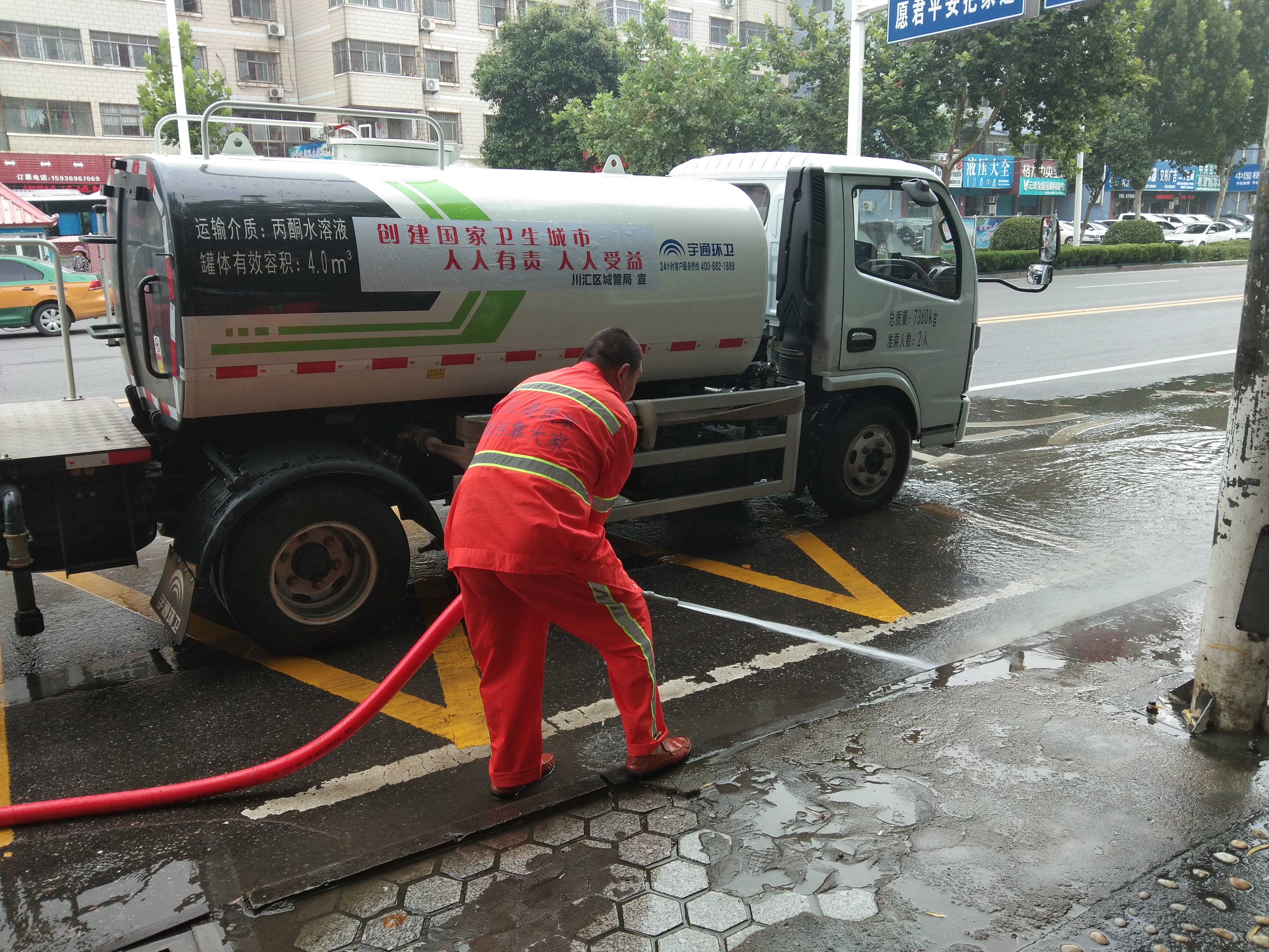 10月4日晚11時(shí)許,大雨如注,市區(qū)育新街行人稀少,李宗喜在雨中向一位保潔人員示范“洗路”,身上的衣服已經(jīng)濕透。
