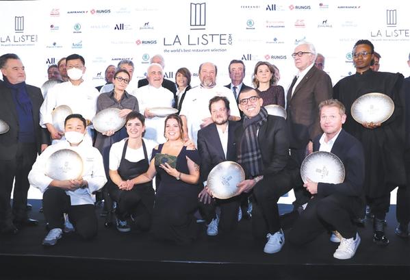 11月29日,在位于巴黎的法國外交部舉行的LA LISTE國際美食榜單揭曉活動現場,獲獎廚師合影留念。