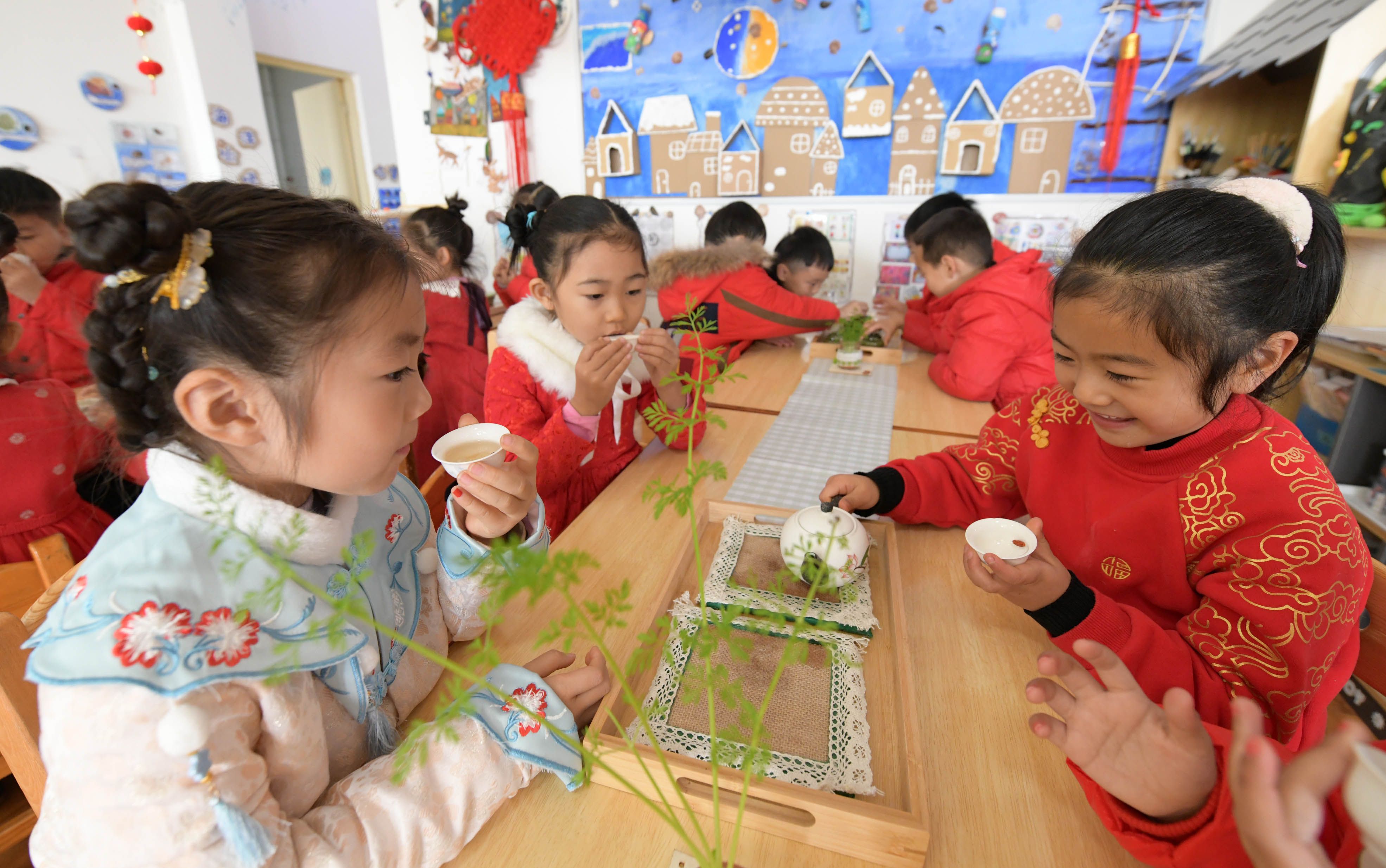 小朋友們學習傳統(tǒng)茶藝,喝冬至暖茶。