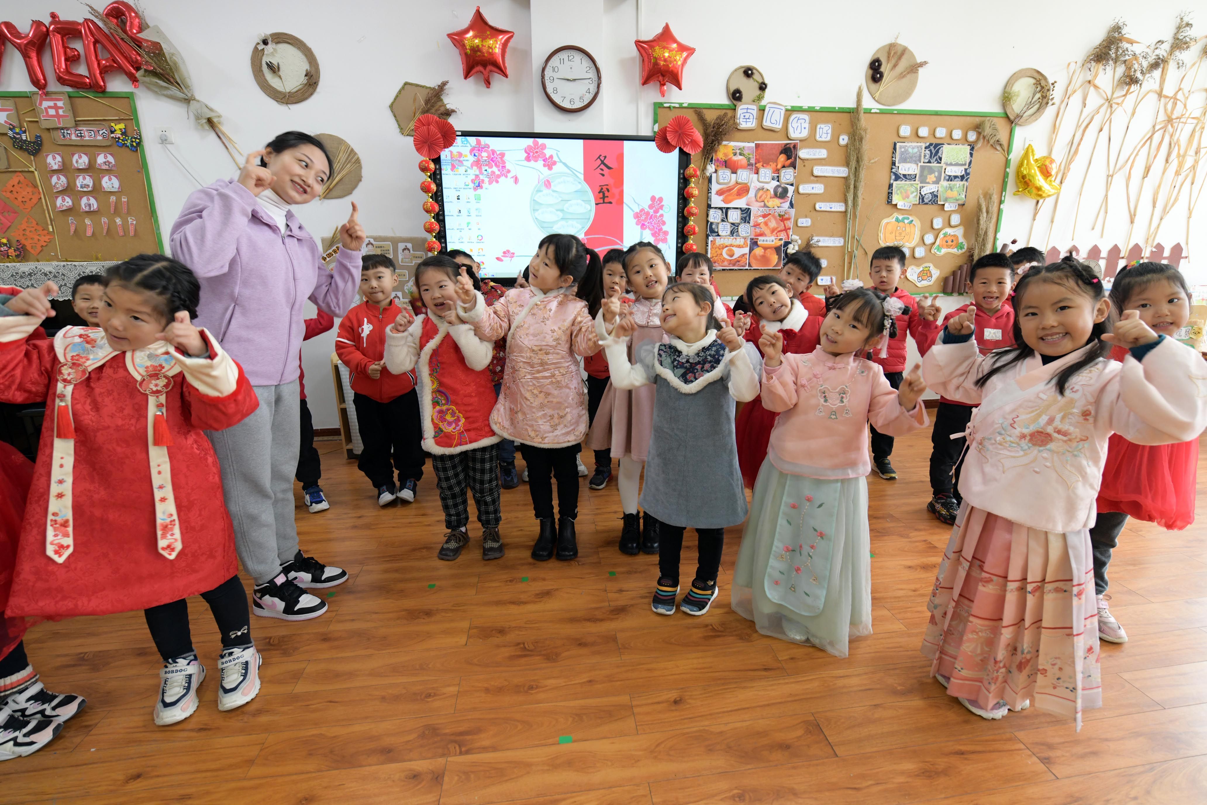 小朋友在老師的指導(dǎo)下學唱冬至數(shù)九歌。