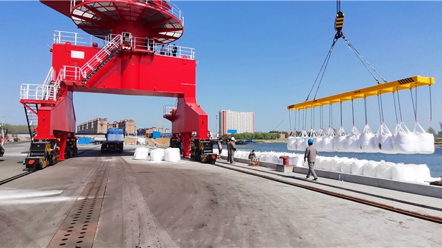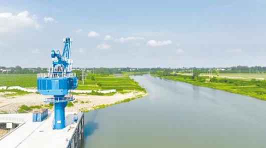 盛夏七月,在項城市東部的項城港,幾架“高聳入云”的新式固定式起重機(jī)的主體已安裝完畢,剩余的部件堆放在地上,巨大的框架和鮮紅的涂裝展示著它們的力量。一側(cè),千噸級貨輪正??吭陂L長的泊位前,起重機(jī)緩緩卸下貨艙內(nèi)的散貨。