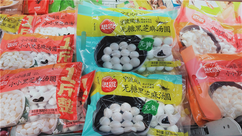 在一家超市內(nèi),除了有傳統(tǒng)口味的芝麻餡、花生餡湯圓,新派口味湯圓,如黃桃餡湯圓、菠蘿餡湯圓、無(wú)糖湯圓亦被放在亮眼的位置。