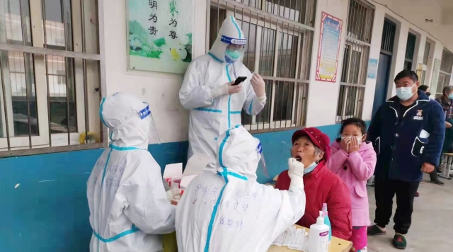 3月25日夜,天空下著小雨,李碧瑩和同事們乘車到市衛(wèi)生健康委員會(huì)集合,與其他醫(yī)院的50多名同仁一道,凌晨4點(diǎn)從周口出發(fā),早上7點(diǎn)到達(dá)太康,簡(jiǎn)單吃點(diǎn)早餐后,便開(kāi)始緊張的核酸檢測(cè)采集工作。