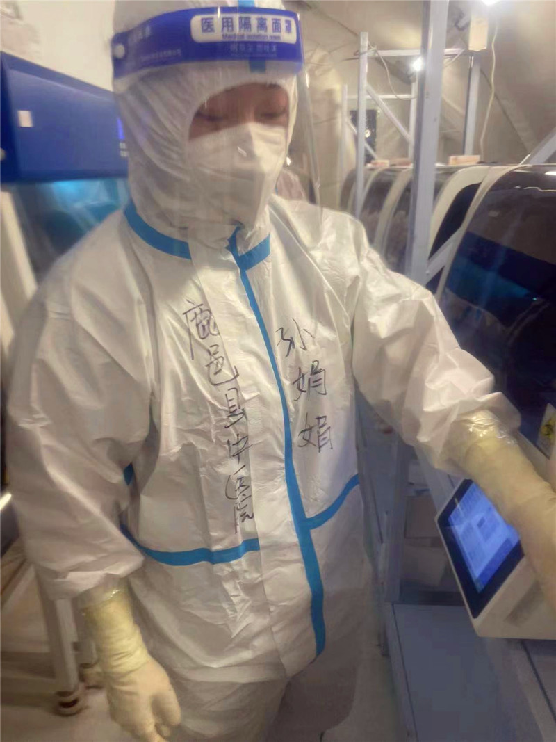 3月18日,孫娟娟及同事進(jìn)駐了長(zhǎng)春疫情最嚴(yán)重的九臺(tái)區(qū),隨行的還有方艙實(shí)驗(yàn)室。次日,孫娟娟和同事們進(jìn)行了防護(hù)培訓(xùn),隨即開始核酸檢測(cè)實(shí)驗(yàn)。孫娟娟穿著密不透風(fēng)的防護(hù)服,身心各種莫名的滋味都涌上來了。當(dāng)她想到這每一個(gè)標(biāo)本后面是一雙雙期盼的眼睛、一個(gè)個(gè)焦慮的家庭,她不禁為自己打氣——加油!我們就是這場(chǎng)疫情的偵察兵,要把偵察到的情報(bào)準(zhǔn)確無誤地傳遞過去。