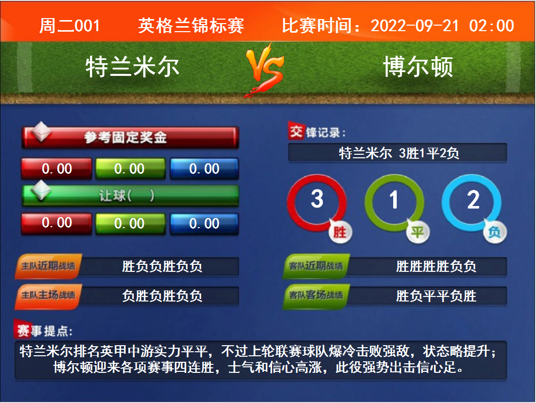 比賽時間:2022-09-21 02:00賽事提點:特蘭米爾排名英甲中游實力平平,不過上輪聯(lián)賽球隊爆冷擊敗強敵,狀態(tài)略提升;博爾頓迎來各項賽事四連勝,士氣和信心高漲,此役強勢出擊信心足。