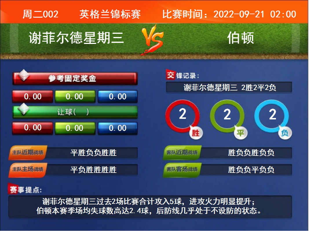 比賽時間:2022-09-21 02:00賽事提點:謝菲爾德星期三過去2場比賽合計攻入5球,進攻火力明顯提升;伯頓本賽季場均失球數(shù)高達2.4球,后防線幾乎處于不設(shè)防的狀態(tài)。