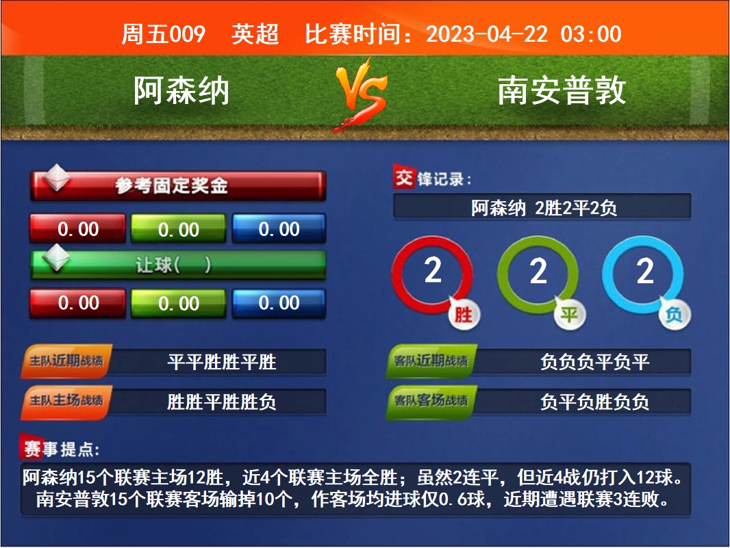 比賽時間:2023-04-22 03:00賽事提點:阿森納15個聯(lián)賽主場12勝,近4個聯(lián)賽主場全勝;雖然2連平,但近4戰(zhàn)仍打入12球。南安普敦15個聯(lián)賽客場輸?shù)?0個,作客場均進球僅0.6球,近期遭遇聯(lián)賽3連敗。