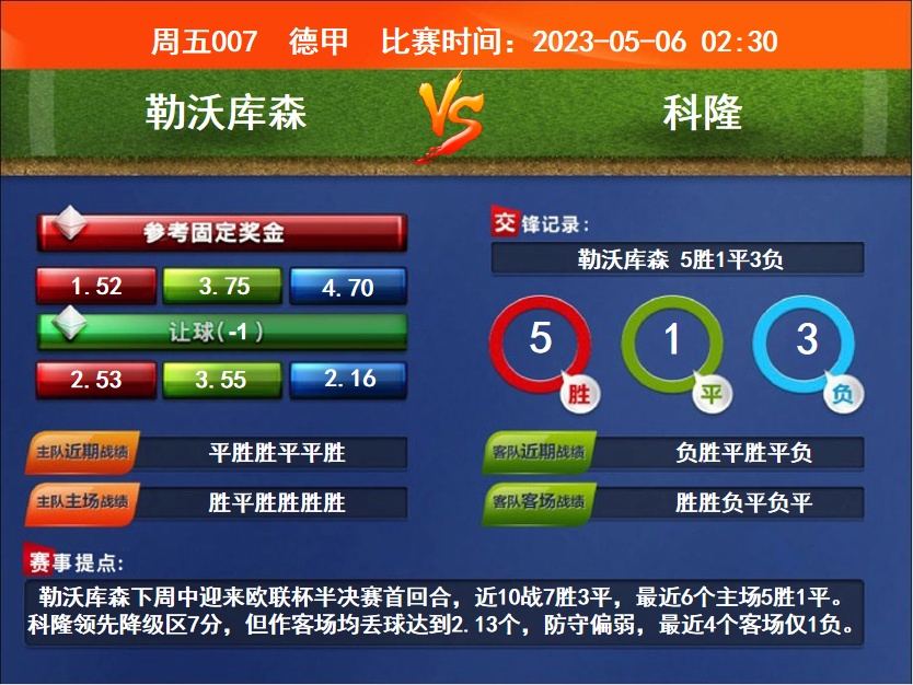 比賽時間:2023-05-06 02:30賽事提點:勒沃庫森下周中迎來歐聯(lián)杯半決賽首回合,近10戰(zhàn)7勝3平,最近6個主場5勝1平。科隆領(lǐng)先降級區(qū)7分,但作客場均丟球達(dá)到2.13個,防守偏弱,最近4個客場僅1負(fù)。