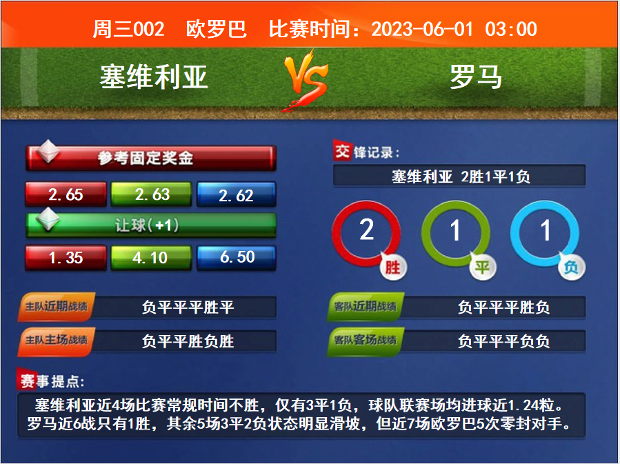 比賽時(shí)間:2023-06-01 03:00賽事提點(diǎn):塞維利亞近4場(chǎng)比賽常規(guī)時(shí)間不勝,僅有3平1負(fù),球隊(duì)聯(lián)賽場(chǎng)均進(jìn)球近1.24粒。羅馬近6戰(zhàn)只有1勝,其余5場(chǎng)3平2負(fù)狀態(tài)明顯滑坡,但近7場(chǎng)歐羅巴5次零封對(duì)手。
