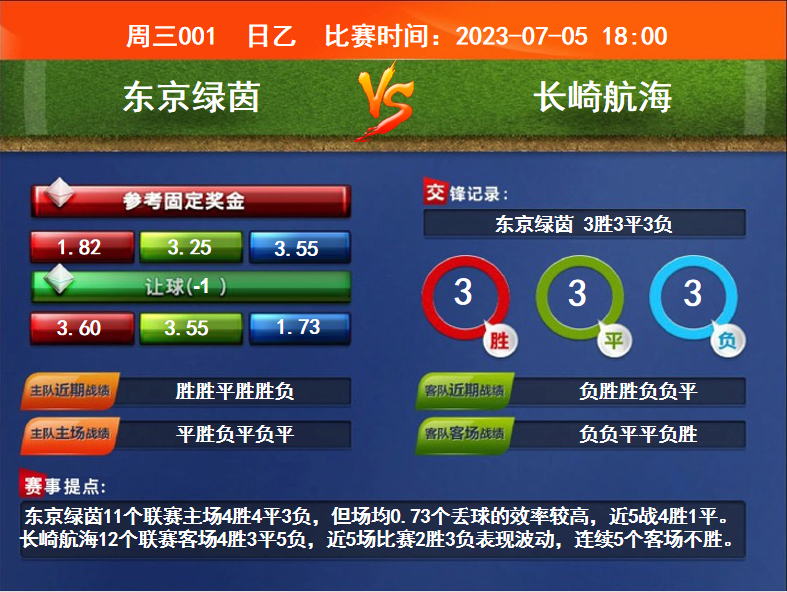 比賽時(shí)間:2023-07-05 18:00賽事提點(diǎn):東京綠茵11個(gè)聯(lián)賽主場(chǎng)4勝4平3負(fù),但場(chǎng)均0.73個(gè)丟球的效率較高,近5戰(zhàn)4勝1平。長崎航海12個(gè)聯(lián)賽客場(chǎng)4勝3平5負(fù),近5場(chǎng)比賽2勝3負(fù)表現(xiàn)波動(dòng),連續(xù)5個(gè)客場(chǎng)不勝。