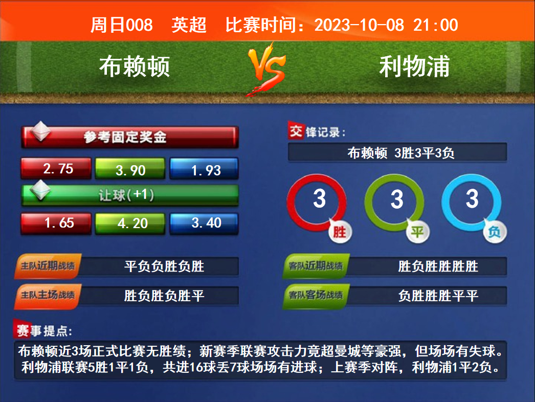 比賽時間:2023-10-08 21:00賽事提點:布賴頓近3場正式比賽無勝績;新賽季聯(lián)賽攻擊力竟超曼城等豪強,但場場有失球。利物浦聯(lián)賽5勝1平1負,共進16球丟7球場場有進球;上賽季對陣,利物浦1平2負。