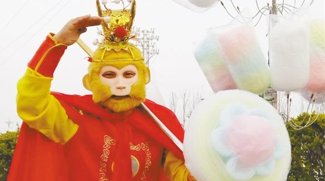 • “媽媽快看,美猴王!”2月14日,在商水文化廣場(chǎng),一名身著美猴王服飾的棉花糖攤主引得市民駐足觀看。記者也隨著人群來(lái)到了這個(gè)小攤前。聽(tīng)聲音,記者感覺(jué)攤主年齡不大。走近一看,只見(jiàn)“美猴王”從一個(gè)個(gè)小盒子將各種顏色的白糖,舀進(jìn)棉花糖機(jī)里,隨后緩緩地轉(zhuǎn)動(dòng)長(zhǎng)竹簽,不一會(huì)兒,一絲絲彩色的糖霜就纏繞在長(zhǎng)竹簽上,經(jīng)過(guò)“美猴王”的巧手制作,一朵彩色的棉花糖“花”不一會(huì)兒就做好了。