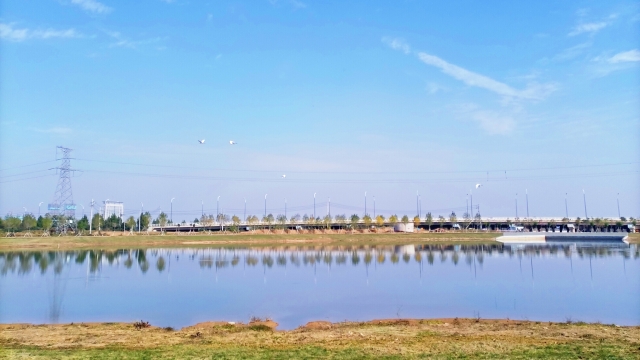 晚秋時(shí)節(jié),周口伏羲湖濕地公園風(fēng)景宜人,舉目望去,波光瀲滟的伏羲湖水面上倒映著藍(lán)天、白云、飛鳥,“秋水共長(zhǎng)天一色”的絕美畫卷讓人心醉。