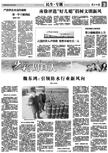 眼下,他正在做一個(gè)新型施工體系的示范、推廣工作。這個(gè)施工體系簡(jiǎn)而言之,就是用新型的非固化膠體粘合防水材料,直接鋪在施工面上,一改過(guò)去用噴槍粘合的方式,省工省時(shí),防水效果更佳?!斑@個(gè)體系做好了,將徹底改變以往的防水工藝?!蔽簴|鴻對(duì)此極有信心。