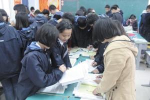 該校將課堂名字定為“求真大課堂”,以“真”字作為學(xué)校一切教育教學(xué)和管理的衡量標(biāo)準(zhǔn)。朱貴華說(shuō),求真就是要真教、真學(xué)、真嚴(yán)、真愛(ài)、真實(shí)、真會(huì)。為提高課堂教學(xué)效果,該校總結(jié)出一套獨(dú)特的課堂教學(xué)方法——“七音和鳴”。分管教學(xué)工作的副校長(zhǎng)徐其運(yùn)用“1234567”,即哆來(lái)咪發(fā)唆拉西”來(lái)詮釋“七音和鳴”法?!?”就是一個(gè)學(xué)習(xí)目標(biāo);“2”就是提前兩分鐘進(jìn)班,布置2個(gè)任務(wù)(出示目標(biāo)、檢查學(xué)情);“3”就是準(zhǔn)備3個(gè)本子,即學(xué)情檢效本、跟蹤本、糾錯(cuò)本;“4”是4個(gè)維度考評(píng),即高速度、準(zhǔn)確度、干凈度、參與度;“5”是5個(gè)跟蹤,即節(jié)跟蹤、日跟蹤、周跟蹤、月跟蹤、學(xué)期跟蹤,堅(jiān)持“抓緊跟蹤不放松、我在文昌必成功”的教育信念;“6”是6個(gè)環(huán)節(jié),即激情導(dǎo)入、自研自探、合作探究、展示質(zhì)疑、師生點(diǎn)評(píng)、當(dāng)堂檢測(cè);“7”是7個(gè)評(píng)價(jià),即教師的教案、學(xué)生的學(xué)案、練案、觀(guān)課記錄的每周業(yè)務(wù)評(píng)價(jià)及對(duì)學(xué)生的即時(shí)性、激勵(lì)性、長(zhǎng)效性評(píng)價(jià)。