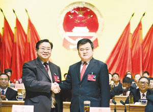 右圖 新當(dāng)選的市人大常委會(huì)主任徐光與李洪民親切握手。(記者 沈湛 攝)