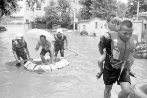 7月14日,四川省瀘州市的消防官兵在龍馬潭區(qū)救援受災(zāi)群眾。當(dāng)日,四川省瀘州市遭暴雨襲擊,部分路段內(nèi)澇嚴(yán)重,交通中斷。據(jù)瀘州市氣象局統(tǒng)計(jì),截至12時(shí),該市最大降雨量超過200毫米。    新華社發(fā)