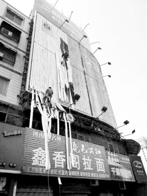 4月9日上午,在周口市區(qū)七一路與大慶路交叉口,兩名工人忙著整修廣告牌,他們“攀附”在墻上的身影,如同電影里的“蜘蛛俠”,讓過(guò)往市民無(wú)不敬畏勞動(dòng)者的辛勞與偉大。晚報(bào)記者 張志新 攝